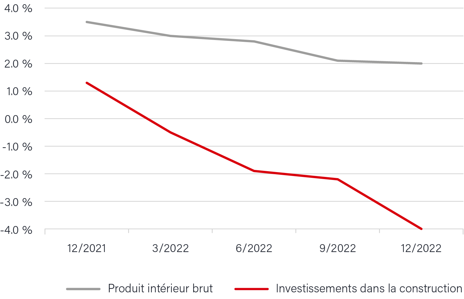Les prévisions de croissance du produit intérieur brut (PIB) sont, après une vigoureuse reprise l’année précédente, retombées de trimestre en trimestre pour se situer à 2 % à la fin de l’année. Les investissements dans la construction ont été impactés plus fortement même que l’économie dans son ensemble. Alors que les attentes étaient encore de 1,3 % en décembre 2021, celles-ci ont chuté en négatif en mars 2022 déjà, où elles ont atteint -0,5 %. Vers la fin de l’année sous revue, le Groupe d’experts des prévisions conjoncturelles de la Confédération prévoyait une contraction des investissements dans la construction de -4 % par rapport à l’année précédente, un niveau qui éclipse jusqu’au fléchissement de croissance lors de la phase la plus critique du COVID-19.
